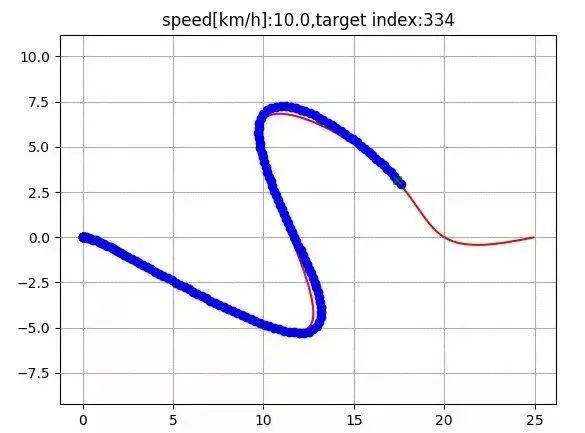 红线为目标路线,绿叉为纯追迹控制的目标点,蓝线为跟踪路线。