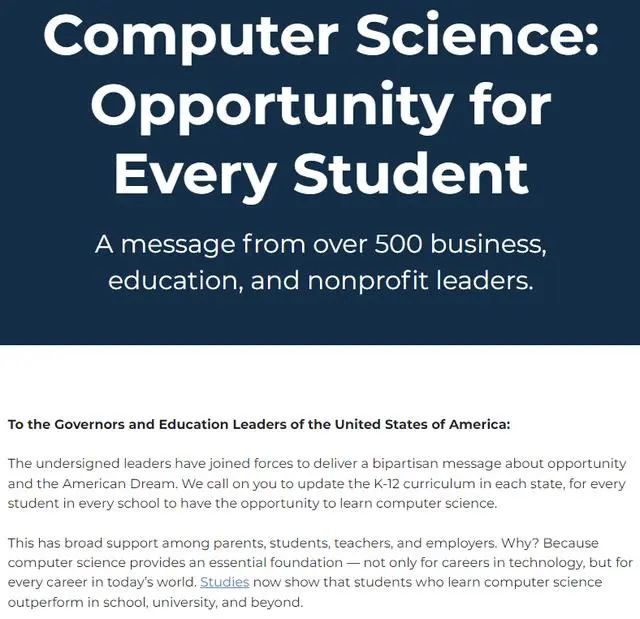 近日,500 余名商业、教育和非营利部门的知名人士签署了一封联名信,呼吁州长和教育领导者更新美国基础教育 K-12 课程,让「每所学校的每个学生都有机会学习计算机科学」。