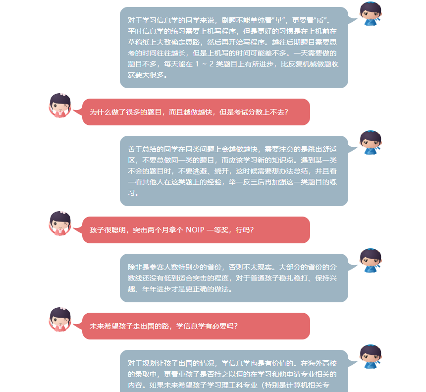 兴趣培养阶段对于小学生或初中低年级学生,在学好语文、数学等课内知识的前提下,可以以兴趣培养为目的了解信息学和计算机科学的科普内容。在这个阶段,最重要的事情是要确认自己是否有兴趣、有信心学信息学,在学信息学的过程中是否能产生强烈的成就感。当孩子有了一定的程序设计能力,喜欢通过编程解决问题之后再去参加考试或竞赛,强化成就感。要把参加考试和竞赛的成绩当成副产物,而不能本末倒置。